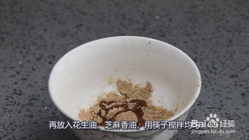 碗中放入40g盐焗粉、沙姜粉,再放入花生油、芝麻香油,用筷子搅拌均匀。