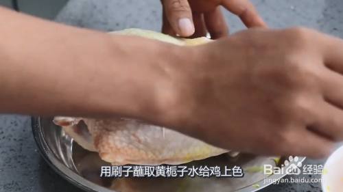 黄栀子拍破放入碗中备用,加一些热水浸泡一下,用纸将鸡表皮的水分擦干,用刷子蘸取黄栀子水给鸡上色。