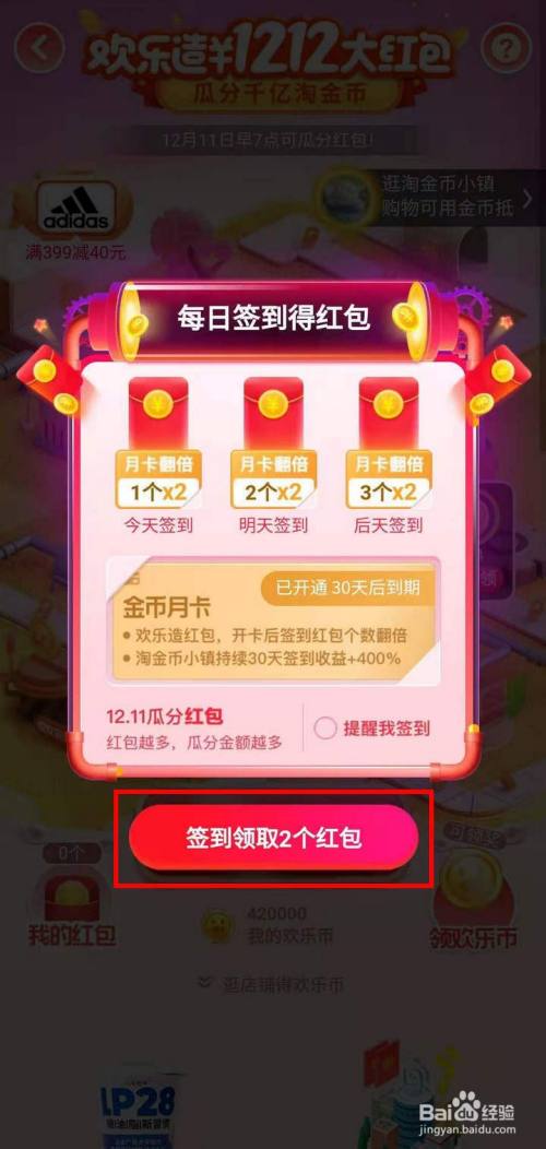 进入活动页面,直接弹窗显示每日签到得红包,中间有个金币月卡,点击“点我立即开通”;