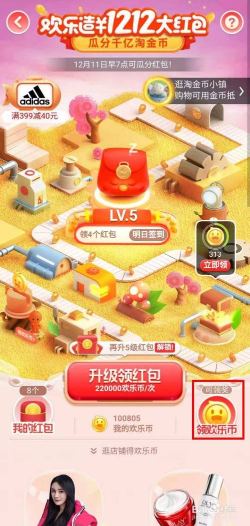 进入欢乐造¥1212大红包页面,整体样式和金币小镇有些像,点击右下角的领欢乐币;