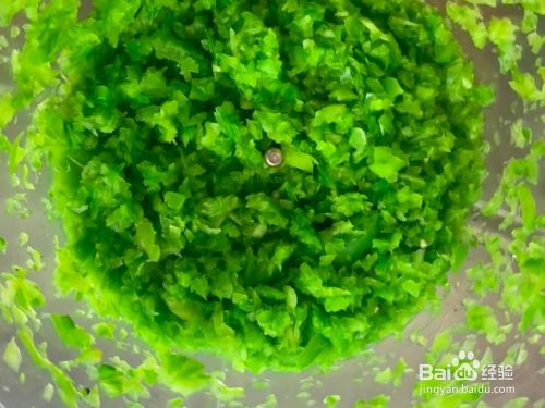 然后把焯好水的青椒放入料理杯,打成辣椒末。倒出攥干水分、备用。