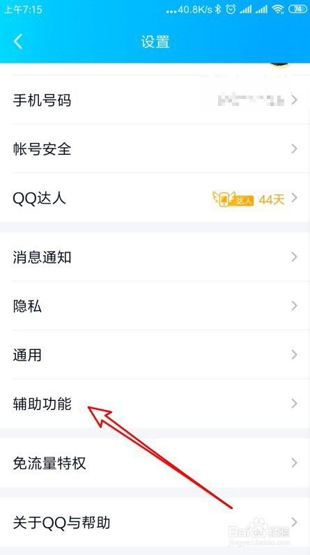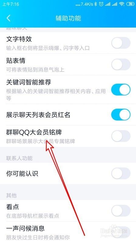 然后在打开的辅助功能页面中找到群聊QQ大会员铭牌的设置项
