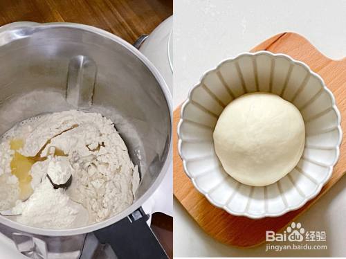 我们将饼皮材料全部投入西式厨师机中,揉成光滑的面团,滚圆后盖上保鲜膜发酵至两倍大