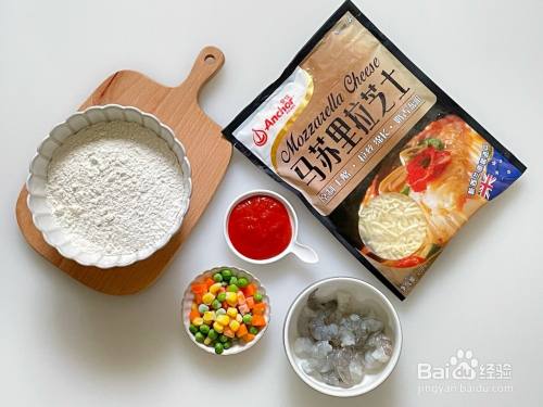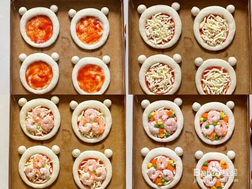 称出8个3克的小面团,揉圆放在两边做成耳朵,中间用叉子叉上洞洞,抹上披萨酱,撒上安佳马苏里拉芝士,放上虾仁,胡萝卜青豆玉米粒