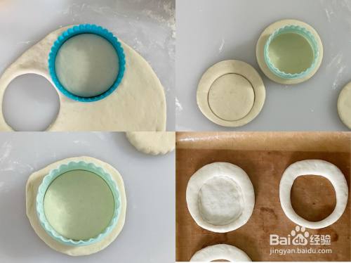 将面团压去气泡后擀成面片厚面片,用10厘米的圆模压出4个大圆片,再用6厘米的模具在靠近下面的位置压出面片,(留出多的地方等下画表情)然后将6厘米的擀薄一点,再用模具压一下,填入中间,将边缘压实;(放在油布或烘焙纸上操作,这样不会走形)