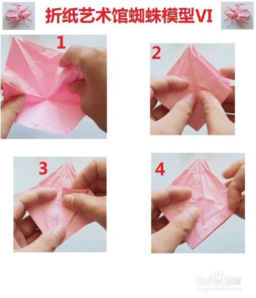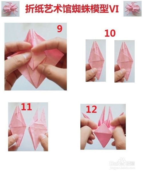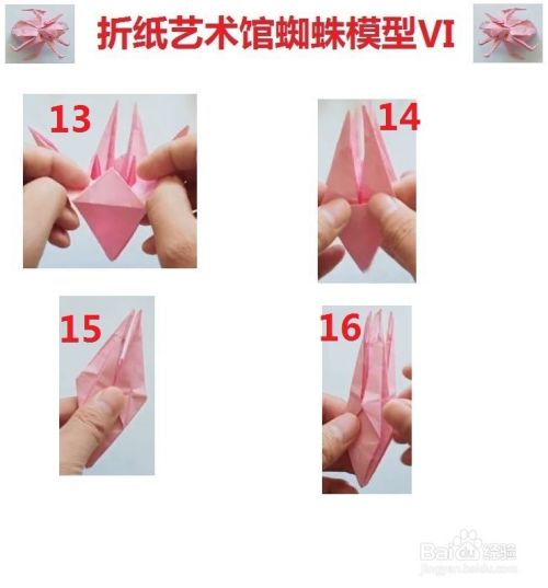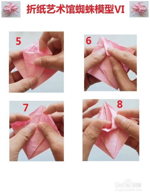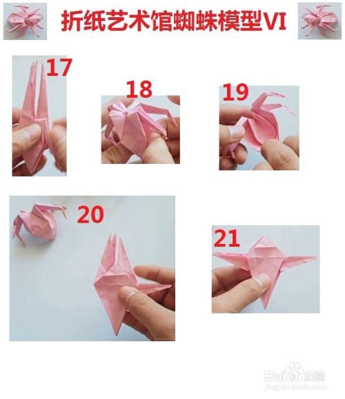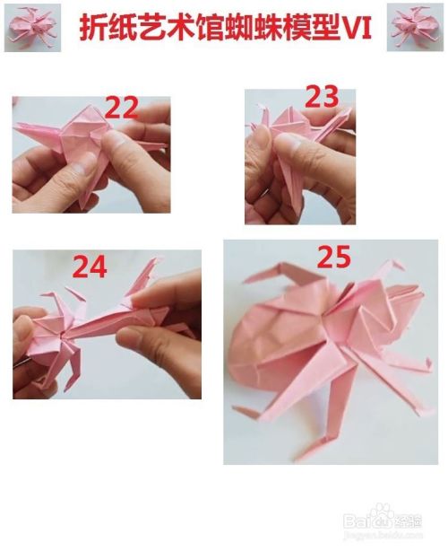 22将右下边折向中竖线后,水平方向顺势折细,23其余几个脚折细后再适当弯曲地折。24将二个元件插在一起。25一个粉红色的蜘蛛就制作完成。