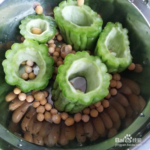 黄豆提前泡好,将泡好的黄豆直接放到苦瓜中间。