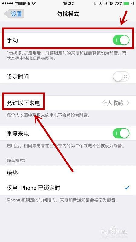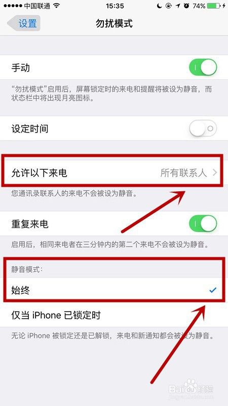 “ 允许以下来电 ” 一栏中点击上 “ 所有联系人 ” ,然后在 “ 静音模式 ” 下勾选 “ 始终 ” 。如下图所示。