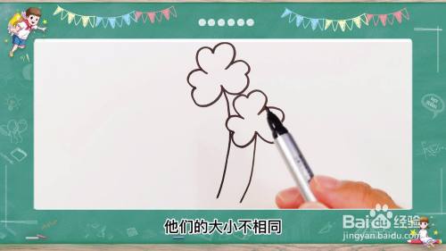再画上草的杆,然后以同样的方式再画两朵,它们的大小不相同,画的位置可以不在同一水平线。