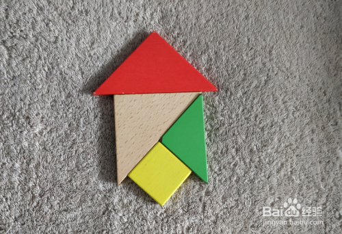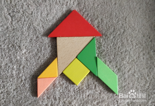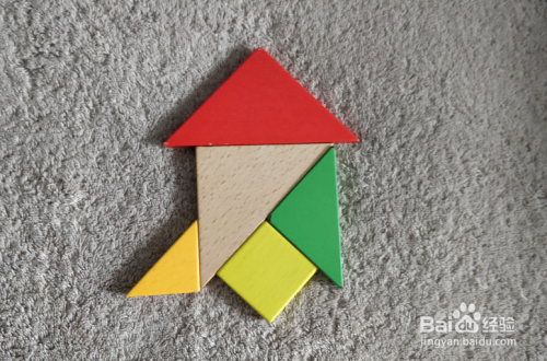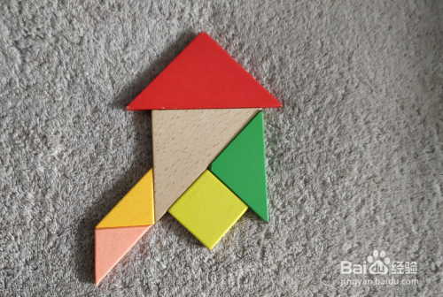 在绿色三角形右侧,放上平行四边形挨着,如图。这样就拼好了。