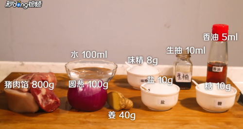 1猪肉馅800g,盐10g,味精8g,圆葱100g,姜40g等食材。