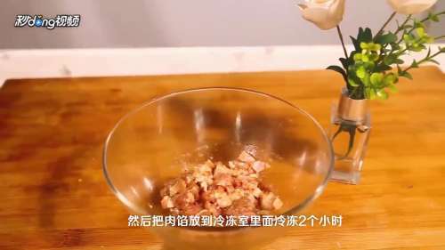 4猪肉馅已经开始粘稠了,加入香油继续搅拌,要注意一直是一个方向,把肉馅放到冷冻室里面冷冻2个小时即可。