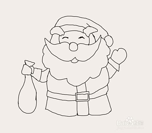 第五步,画出圣诞老人两只手的形状,接着画出左手提的袋子的形状。