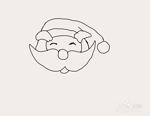 第二步,画出圣诞老人的头部形状,还有画出他头上的帽子形状,画出眼睛、眉毛形状,