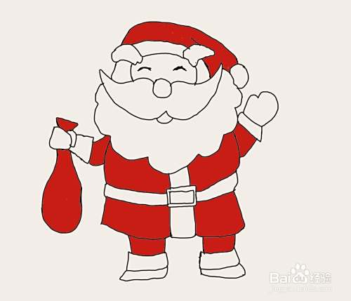 第七步,拿出彩笔,给圣诞老人的帽子、衣服、手提袋都涂上颜色红颜色。