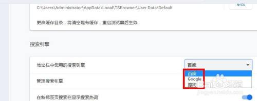 点击“地址栏中使用的搜索引擎”右侧的箭头,在下拉列表里选择其它搜索引擎。