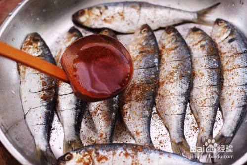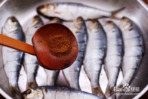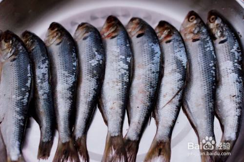 把腌制好的海鲫鱼,撒上适量面粉,让每条鱼都均匀地蘸上一层薄薄的的面粉。