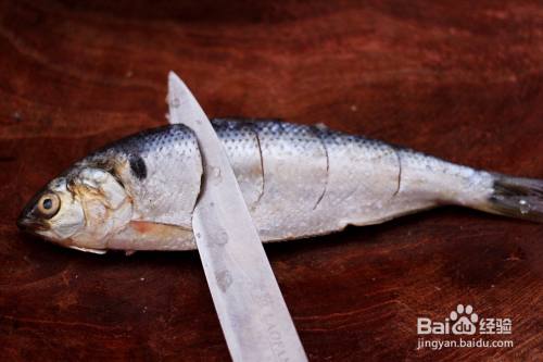 把洗净的海鲫鱼改一下刀,这样炸的海鲫鱼入味又能炸透。