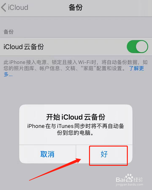 在备份页面中,把【iCloud云备份】对应的按钮打开,弹出的小窗口中,点击【好】,手机就开始把旧手机的数据备份到新的苹果手机上,如图所示。