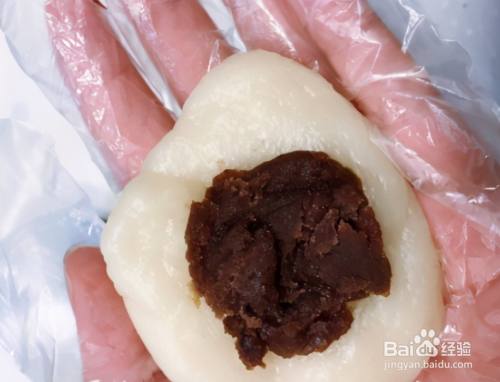 第四步,糯米面团分成均等的小份,取一份糯米面团,用手压成小圆饼,放入一个豆沙馅,收口捏紧,在案板上滚一滚,搓圆,按照此方法依次做好;