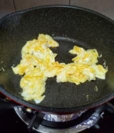 热锅,放油,下鸡蛋炒熟盛出备用。