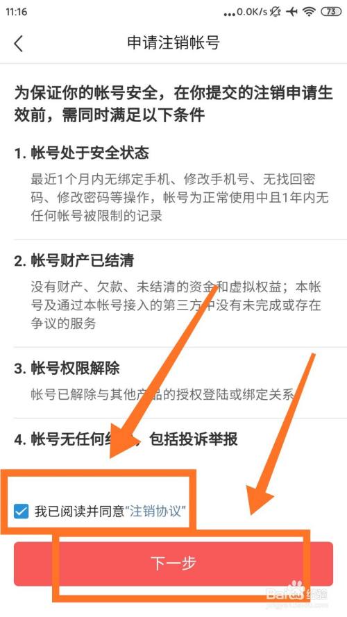 进入申请账号注销界面,勾选“我已阅读”,再点击“下一步”,按照操作一步步即可完成操作。