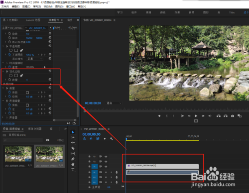 单击选中时间轴视频轨道上的视频素材,打开效果控件窗口,在效果控件窗口中找到“羽化边缘”这个视频效果设置。