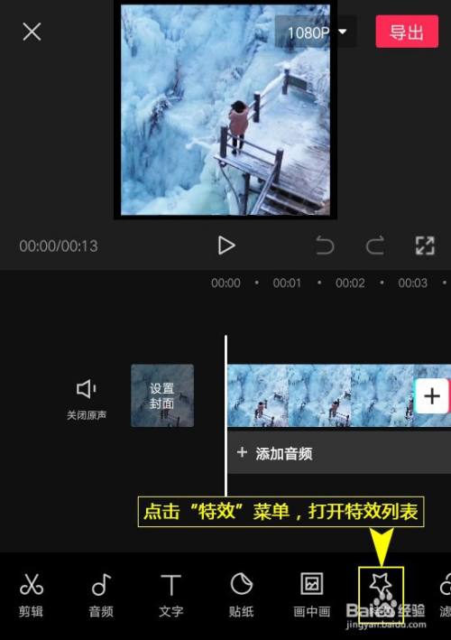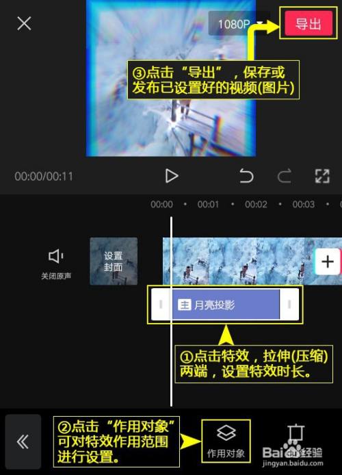 设置特效。点击已添加的特效,拉伸(压缩)两端,设置特效时长;点击“作用对象”,可对特效作用范围进行设置;点击“导出”,保存或发布已设置好的视频(图片)。