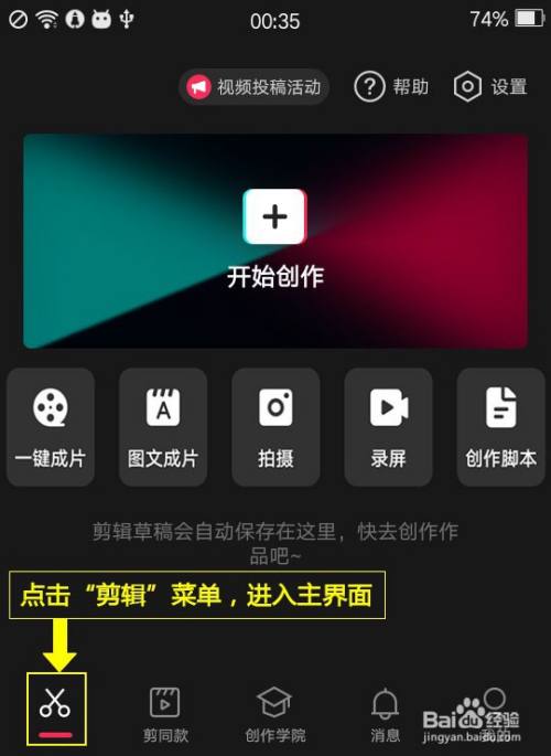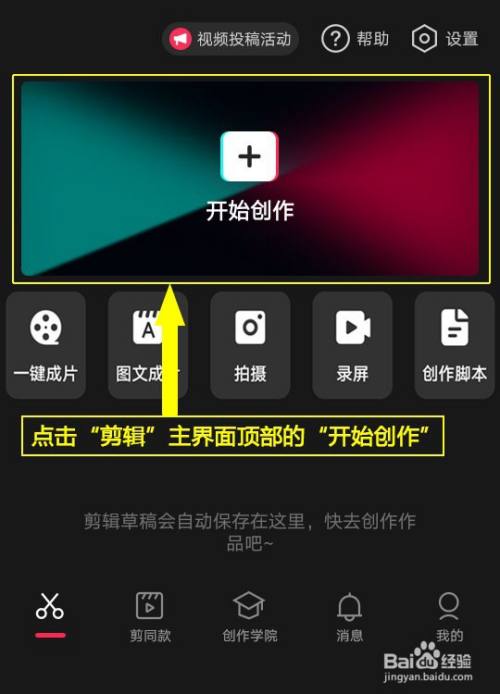 开始剪辑。在剪辑主界面顶部,点击“开始创作”。