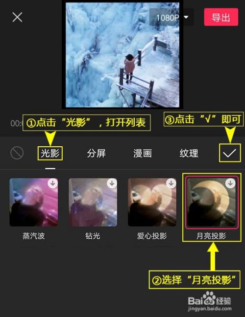选择特效。点击“光影”选项卡,打开列表,选择“月亮投影”特效,点击列表右上角的“√”即可。