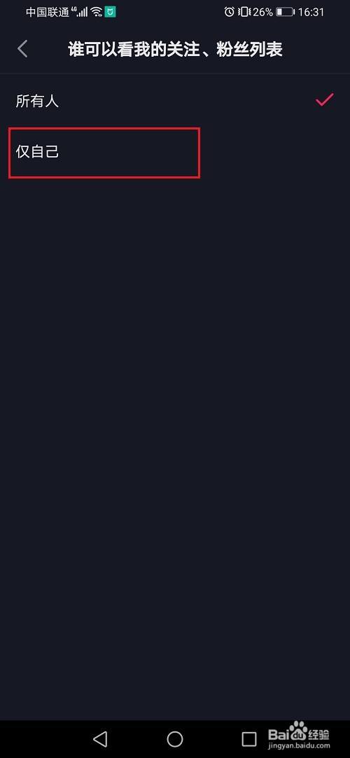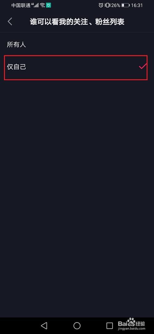 第五步勾选仅自己之后,就成功设置粉丝不让别人看到了