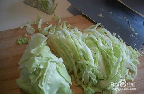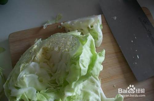 将包菜对半切,去掉中间的梗,切成丝,青椒、红萝卜也切成丝