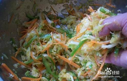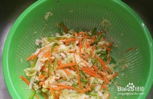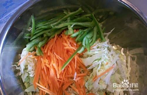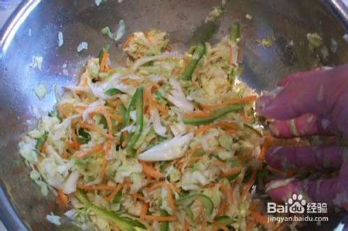 将切好的包菜丝、青椒丝、红萝卜丝放入盆中,撒上盐,用手轻揉直到出水,这时的菜也软了