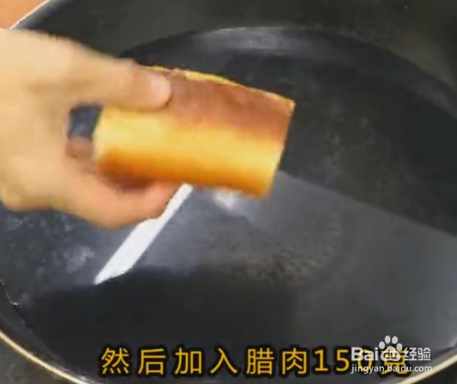 把锅烧热之后加入适量的底油 油温5成热之后将切好的腊肉腊肠腊猪舌一起下锅翻炒