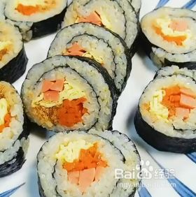 紫菜上放上米饭,放上配菜,放上肉松,卷起来,切成小块即可