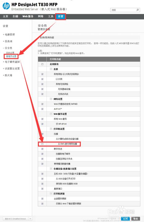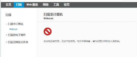 所以首先在 设置—安全性—管理员设置—打印机功能—打印机设置—扫描—从EWS进行网页扫描,勾选上,才可使用Webscan功能。