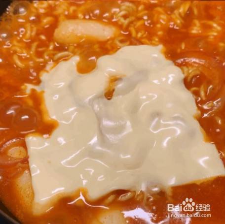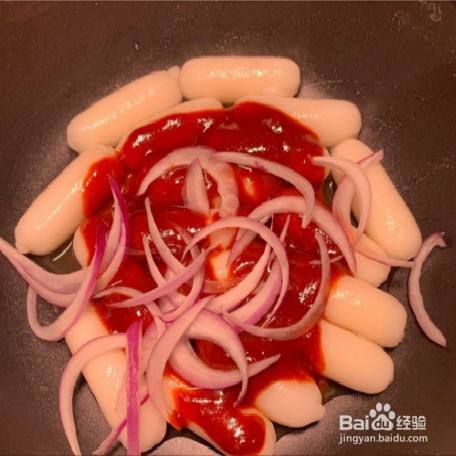 将酱汁和提前煮熟年糕一起入锅,加点洋葱丝,加500ml水煮开