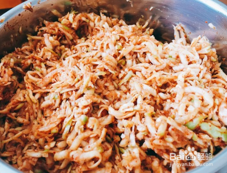 加上白糖、辣椒粉、白醋和食盐,再将晾凉的食用油放入,加上味精,戴上一次性手套,将其充分抓拌均匀;