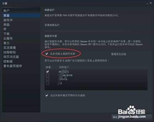 进入设置界面,点击左边的“家庭”勾选“在此电脑上授权库共享”。