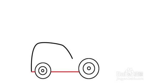 在其左边下方画轮子,先画一个小圆,再在其外画稍大的同心圆,再画一个大的圆在其外圈,轮子就好了。而后用同样的方法,在线条轮廓右边离开一段距离外画稍大的轮子。