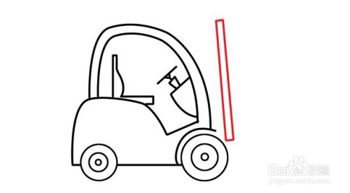 在车棚线上叠加画斜线与弧线勾画组合的形状,勾画出方向盘的位置,然后在斜线上叠加勾画梯形,再短斜线而后一个夹角线条,再在其上画斜线作为方向盘。