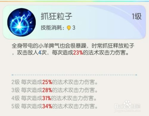 鬼金羊的技能,技能2:抓狂粒子。攻击技能,攻击敌人4次,每次造成23%的法术攻击力伤害。满级34%的伤害。如图