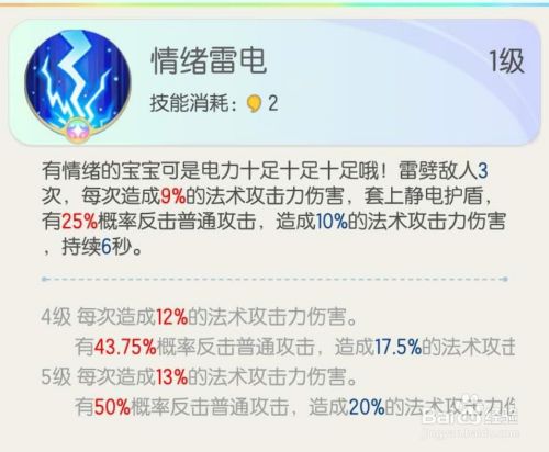 鬼金羊的技能,技能1:情绪雷电(非活动下的技能是小情绪静电)。攻击技能,雷劈敌人3次,每次造成9%的法术攻击力伤害,同时套上静电护盾,有25%概率反击普通攻击,造成10%的法术攻击力伤害,持续6秒。随着技能等级的提升而伤害提升。如图