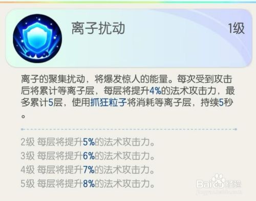 鬼金羊的技能,技能3:离子扰动。被动技能,每次受到攻击后将累计等离子层,每层将提升4%的法术攻击力,最多累计5层,持续5秒。满级提升8%。如图