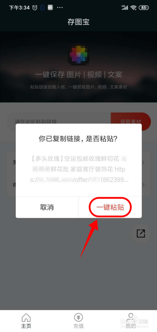 步骤三:回到手机主界面打开存图宝App,存图宝会自动识别复制的标题链接,弹出粘贴标题链接窗口后,选择“一键粘贴”按钮,粘贴复制的标题链接,获取标题链接里面的视频。如下图: