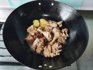 鸭块放入油锅,加料酒,生姜,八角爆炒。