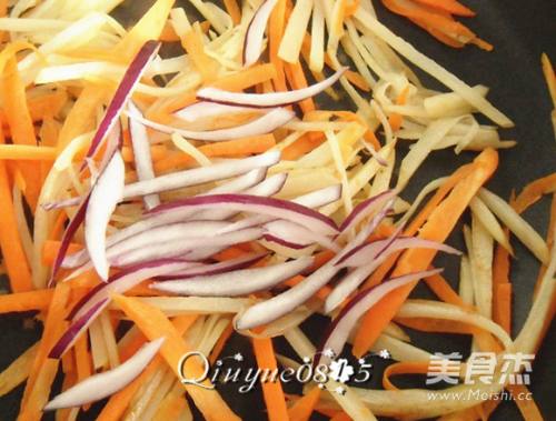 5土豆、胡萝卜均切丝备用(土豆丝泡凉水中)