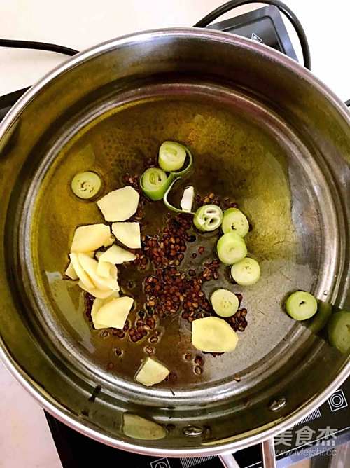 8锅内加入大豆油烧热,加入花椒粒煸炒1分钟后加入葱姜片炒出香味