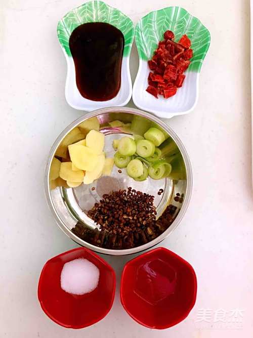 5辅料:姜片,葱段,花椒粒,干辣椒,料酒,蚝油,精盐,豆油
