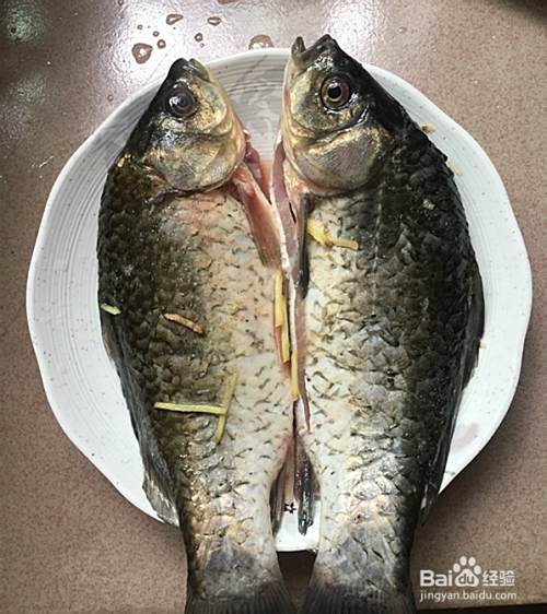 清理干净的鲫鱼,两面抹上料酒,胡椒粉,再撒少量姜丝,腌制20分钟。
